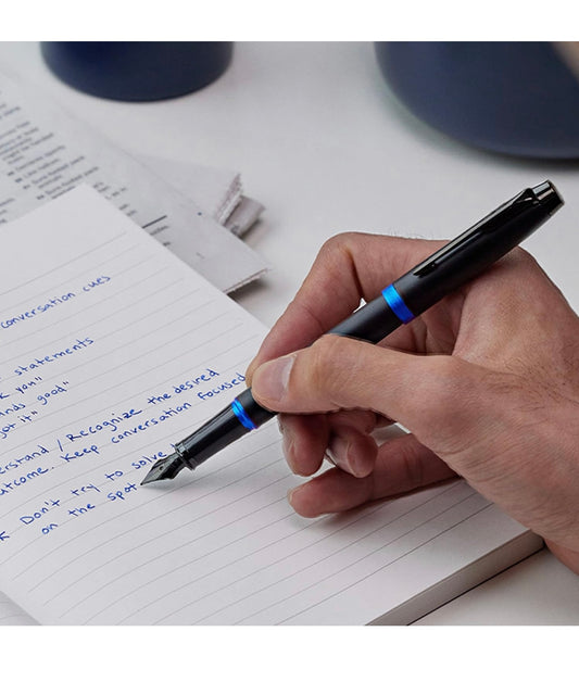 Parker IM Vibrant Rings Fountain Pen | Satin Black Lacquer with Marine Blue Accents | Medium Point with Blue Ink Refill | Gift Box